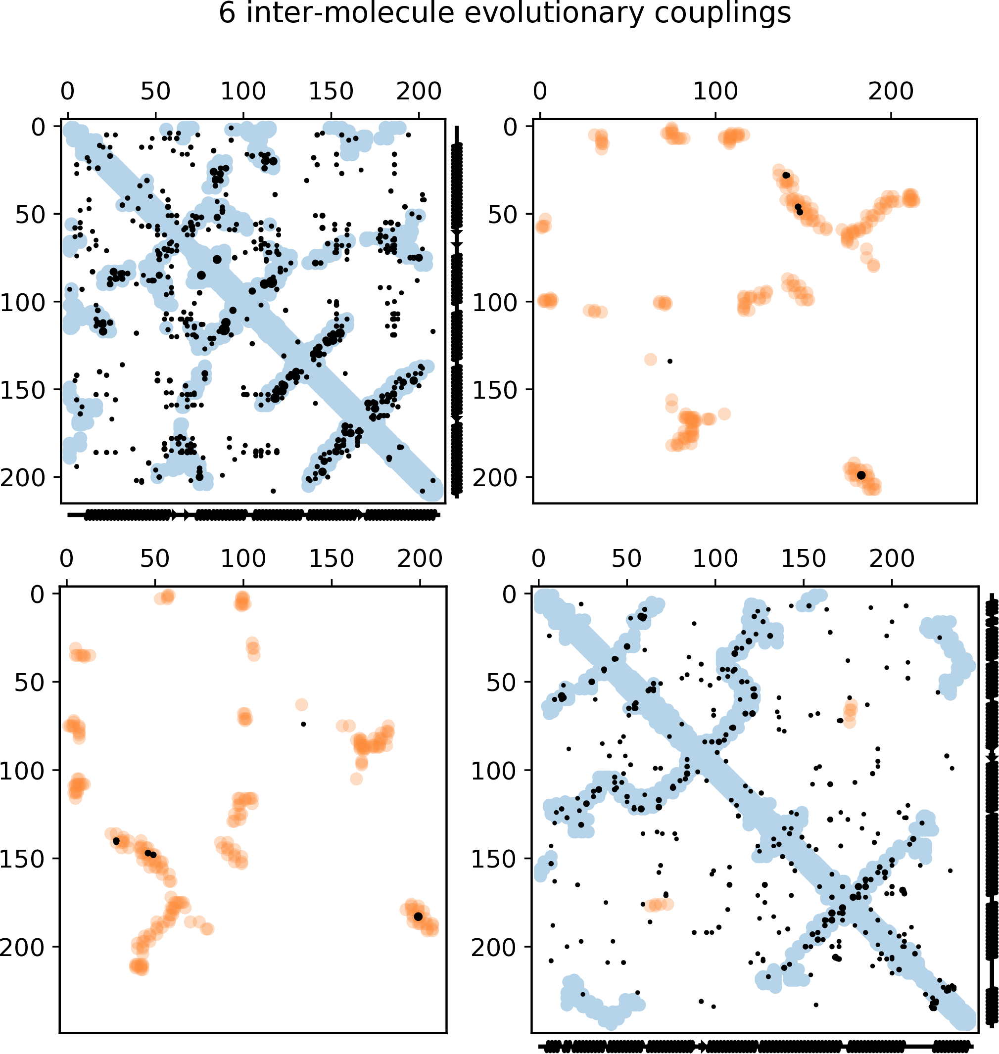 Contact maps show the inter-protein ECs above the confidence threshold (precision > 80% on test set) for each model, as well as the top L/2 intra protein ECs for each monomer. Top left panel shows the first monomer intra-protein contacts, bottom right panel shows the second monomer intra-protein contacts, top right and bottom left panels show inter-protein contacts.