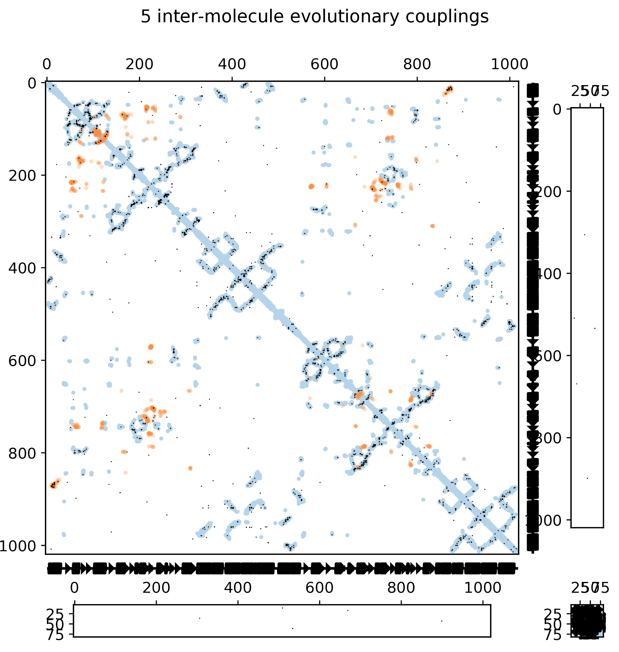 Contact maps show the inter-protein ECs above the confidence threshold (precision > 80% on test set) for each model, as well as the top L/2 intra protein ECs for each monomer. Top left panel shows the first monomer intra-protein contacts, bottom right panel shows the second monomer intra-protein contacts, top right and bottom left panels show inter-protein contacts.