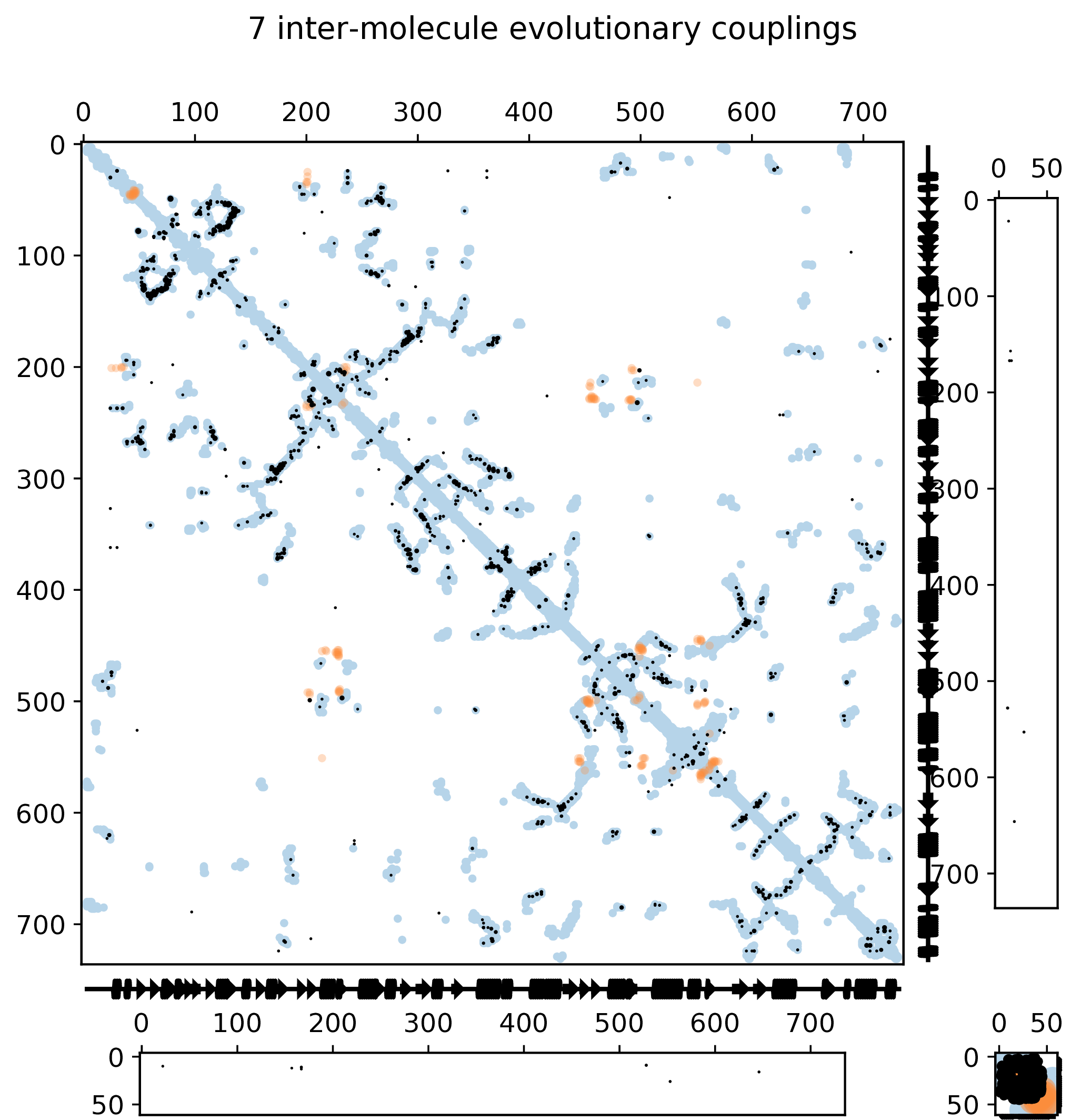 Contact maps show the inter-protein ECs above the confidence threshold (precision > 80% on test set) for each model, as well as the top L/2 intra protein ECs for each monomer. Top left panel shows the first monomer intra-protein contacts, bottom right panel shows the second monomer intra-protein contacts, top right and bottom left panels show inter-protein contacts.