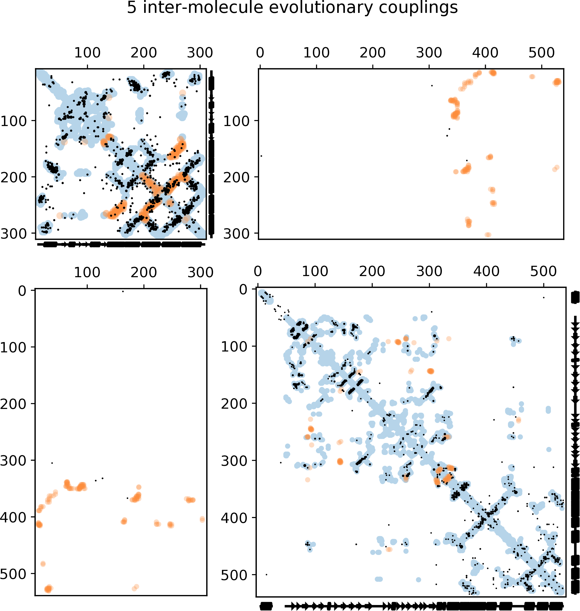 Contact maps show the inter-protein ECs above the confidence threshold (precision > 80% on test set) for each model, as well as the top L/2 intra protein ECs for each monomer. Top left panel shows the first monomer intra-protein contacts, bottom right panel shows the second monomer intra-protein contacts, top right and bottom left panels show inter-protein contacts.