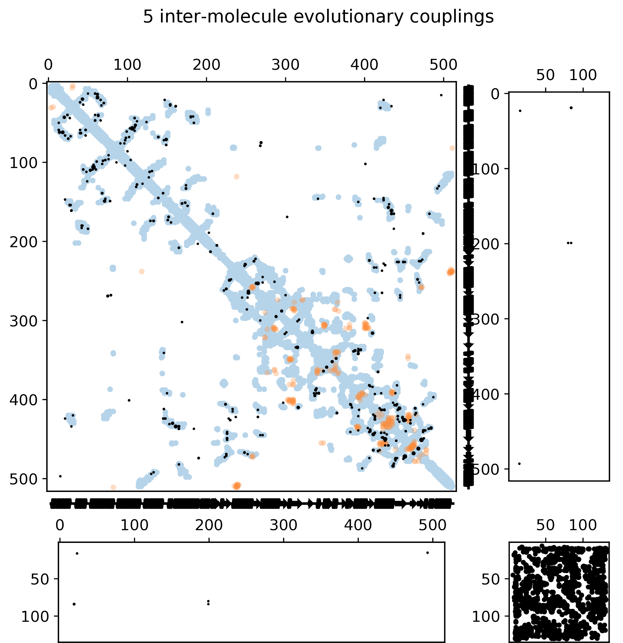 Contact maps show the inter-protein ECs above the confidence threshold (precision > 80% on test set) for each model, as well as the top L/2 intra protein ECs for each monomer. Top left panel shows the first monomer intra-protein contacts, bottom right panel shows the second monomer intra-protein contacts, top right and bottom left panels show inter-protein contacts.